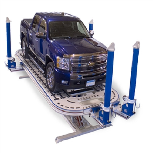 The 22' American Freedom Frame Machine with 4 Towers 9014224 – professional-grade frame rack with four 10-ton hydraulic pull towers for precise straightening of unibody cars up to full-size four-door heavy-duty dually trucks. Features movable towers that ride on a track for full access, quick connect no-drip hydraulic couplers (four each side, eight total), and a 22 ft bed with 88" width between treadways at 24" working height. Made in the USA with smart, simple design for fast setups and fewer breakdowns, it includes pumps and hoses per tower. Choose between 20 ft. or 22 ft., 2, 3 or 4 tower models – the only machine of its kind made in the USA. Ideal for busy collision shops needing efficient space-saving repairs on frames, panels, and structures.