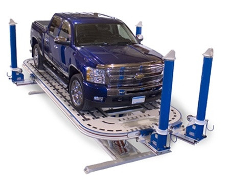 The 22' American Freedom GT Frame Machine 4 Tower 9014234 – professional-grade frame rack with four 10-ton hydraulic pull towers for precise straightening of unibody cars up to full-size four-door heavy-duty dually trucks. Features a 92-inch wide platform, adjustable working heights from 12 inches to 42 inches, and 12,000-pound lift capacity to handle heavier and wider vehicles, boosting shop productivity. Movable towers ride on a track for full access, with quick connect no-drip hydraulic couplers (four each side, eight total). Made in the USA with smart, simple design for fast setups and fewer breakdowns – the only machine of its kind built domestically. Ideal for busy collision shops needing efficient space-saving repairs on frames, panels, and structures.