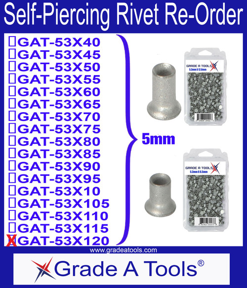 The Aluminum Self Piercing Rivets - SPR, 5.3mm x 12.0mm, 100/Box – premium quality self-piercing rivets designed for precision aluminum & steel bonding in collision applications. These 5.3mm diameter x 12.0mm grip length rivets provide strong, reliable joints for thin aluminum structures on Ford, BMW, GM, Audi, Jaguar, Land Rover, Mercedes Benz, and domestic/foreign vehicles.