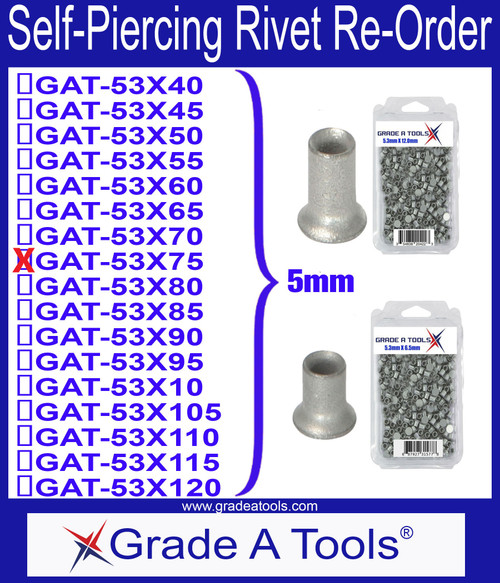 The Aluminum Self Piercing Rivets - SPR, 5.3mm x 7.5mm, 100/Box – premium quality self-piercing rivets designed for precision aluminum & steel bonding in collision applications. These 5.3mm diameter x 7.5mm grip length rivets provide strong, reliable joints for thin aluminum structures on Ford, BMW, GM, Audi, Jaguar, Land Rover, Mercedes Benz, and domestic/foreign vehicles.
