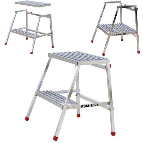 The 24" Adjustable Aluminum Step & Work Stand is a lightweight, heavy-duty platform perfect for collision, automotive, and detail shops. The removable top step quickly switches between two heights using easy quick-release pins, giving you the ideal boost to reach hood centers, windshields, or roof areas. A fixed bottom step provides stable footing while the all-aluminum frame supports 400 lbs. At only 15 lbs, this USA-made stand is easy to carry yet built tough for daily professional use.