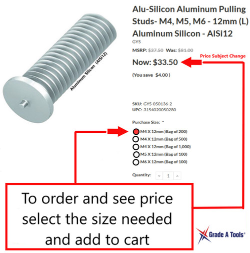 Aluminum Silicon (AlSi12) dent pulling weld studs works with a most all dent pulling models such as GYS Arcpull, Prospot PS-DA5, Chief Multispot M35 and other brands. Studs are come in M4, M5, M6 sizes and are 12mm long. These are the Point faced studs that are the most commonly used in the collision repair industry. Available in Bags of 100, 200, 500 or 1,000. See our order menu for available sizes and quantities. 050136, 048126, 048003, 050280 GYS. see our photos for more information.