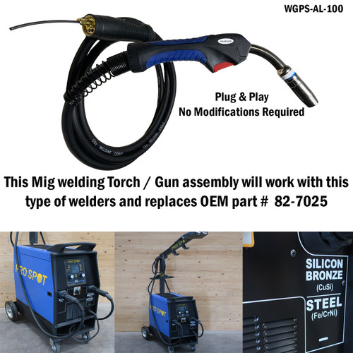 Aluminum MIG torch / welding gun assembly is a Non-OEM replacement for prospot SP-1, SP-2, SP-5 DP & SP-5.3 welders. Torch comes with a blue color durable molded handle and is marked with a white "Aluminum" tag for easy identification. Welding gun torch includes a 10' graphite liner that works with the euro connecting welding lead. In addition the torch assembly lead also incorporates an ergonomic grip with a swivel ball handle design to relieve hand fatigue. The welding torch - gun is "plug and play" and requires no modifications, compares to and replaces pro spot part # 82-7025. Includes a 21 Piece replacement consumable kit (part #CTD-WG-KIT-B21). Items ship with a heavy duty graphite liner guard. Note: OEM manufacture does not include the 21 Piece consumable package that we offer which is a $85.00 Retail Value. AL-100 series