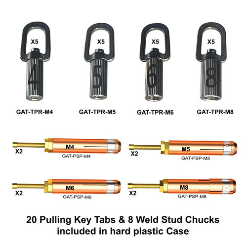 This aluminum dent pulling weld stud kit works with Prospot and most other aluminum dent pulling systems, the kit includes a aluminum weld studs, pulling ring tabs, and stud holding chuck-electrodes. The stud kit has M4, M5, M6, M8 range of threaded studs and accessories. All of this comes preloaded inside a double latching hard plastic case with 1,028 piece. Professional tool and consumable kit for those who want the best quality.