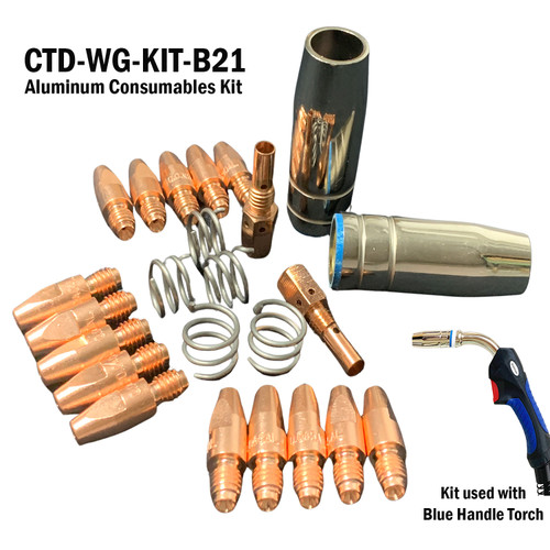 This 24-piece aluminum MIG torch consumable kit is specifically designed to work with ProSpot 82-7025 blue-handle aluminum torches and Collision Tools Direct CTD-WGPS-AL-100. All parts are high-quality aftermarket equivalents that meet or exceed ProSpot OEM performance. This dedicated ProSpot-compatible kit ships in a sturdy 7" × 5" × 1.5" plastic storage case for easy shop organization.