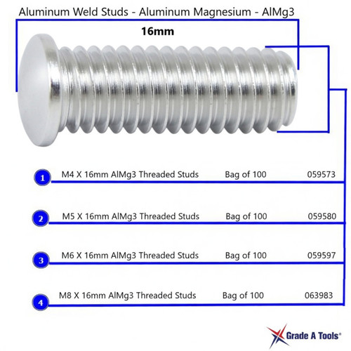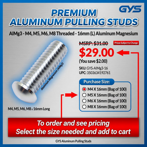 Aluminum Pulling Studs AlMg3 deliver excellent weld strength and performance for professional aluminum dent repair. These high-quality AlMg3 aluminum-magnesium alloy studs feature M4, M5, M6, and M8 threading with a 16mm length and round face weld side. They provide consistent results when used with drawn arc dent pullers, enabling secure pulls on aluminum vehicle panels while minimizing damage to surrounding areas. Ideal for collision shops and auto body technicians needing reliable consumables.