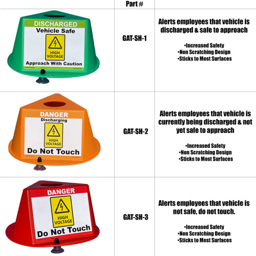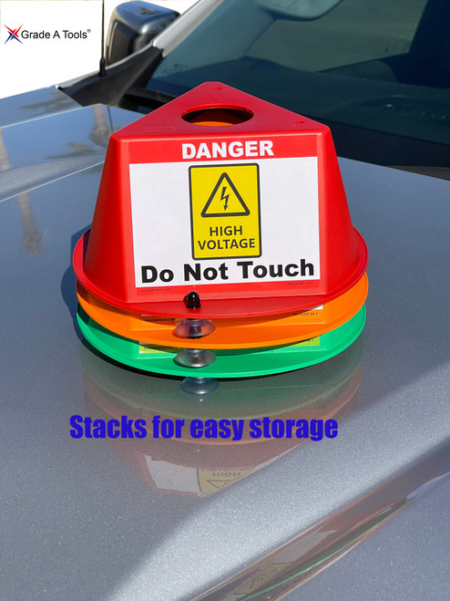 EV Car Safety Hat Kit – 9-Pack of suction cup design, roof-mounted visual warning system every collision center and EV-certified shop uses to keep technicians safe around high-voltage vehicles. These oversized, bright color-coded domes instantly communicate exact vehicle status from across the shop, no accidental shocks. Mounts in seconds with powerful suction cups that grip paint, glass, or roof panels securely with zero damage – no magnets, no scratches.