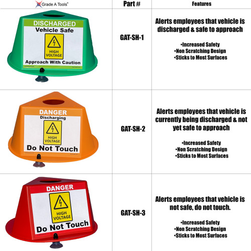 EV Car Safety Hat Kit – 3-Pack of suction cup design, roof-mounted visual warning system every collision center and EV-certified shop keeps on hand. These oversized, color-coded domes instantly tell the entire shop the exact high-voltage status of any vehicle – no guesswork, no shocks. Mounts in seconds with powerful suction cups that grip paint, glass, or roof panels securely with zero damage – no magnets, no scratches.