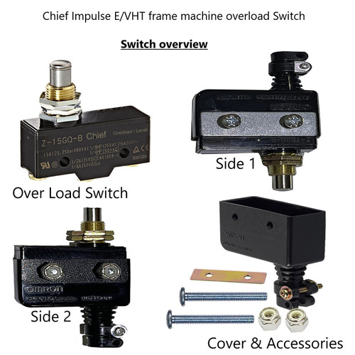 The Replacement Chief Impulse Overload (Level) Switch Assembly replaces Chief OEM p/n 450956 and is the complete bottom-mounted safety switch used on all Chief Impulse frame machines. This ready-to-install kit includes the overload/level switch, protective cover, retainer bracket, two nylon lock nuts, and six screws in three lengths (1", 1-1/8", and 1-1/4") to suit every mounting position. Exact-match assembly restores full safety shutdown protection in minutes with no modifications required.