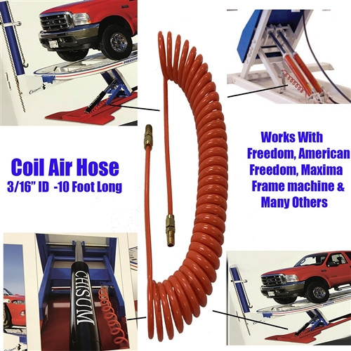 The GAT-7018 Orange Coil Hose is a durable replacement air line designed specifically for Chisum frame machines, supplying compressed air to the pneumatic lock cylinders on the lifting mechanism. With a 3/16" inner diameter and maximum 10 ft length (easily cut to fit), this high-quality coiled hose ensures reliable airflow, flexibility, and resistance to kinking in busy collision repair environments. Compatible with popular models like Freedom, American Freedom, Mustang, and various Maxima series frame machines for seamless integration and dependable performance.