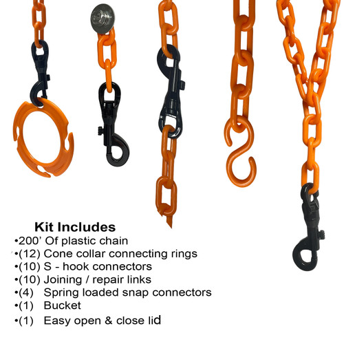 This Orange plastic safety chain kit designed for EV designated stalls, is perfect for collision and automotive repair centers. The Chain is a 1.5” X ¼” (38mm X 6mm) UV resistant durable heavy-duty Polyethylene chain. This kit was designed for the collision repair and automotive EV centers. Kit includes 200 feet of chain, (12) cone collar connectors, (10) orange S-Hooks, (10) Orange joining / repair links, (4) black spring-loaded snap connectors. This kit can also be used to assist in parking, Traffic and crowd control. The orange color is perfect for electrical repair environments.
