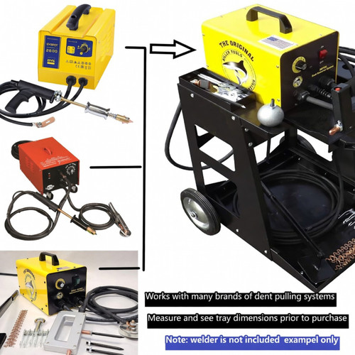 The Dent Puller Cart GAT-DPC-100 is a rugged 2-tray rolling cart built for collision and auto body shops. With a 250 lb load capacity, it easily transports dent pullers, stud welders, and related equipment around the shop. Large 7" rear wheels provide smooth movement over shop floors while the sturdy design keeps tools organized and readily accessible during repairs.