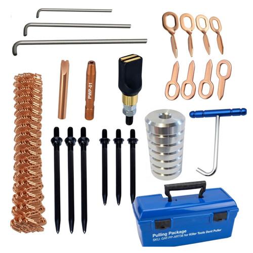The Grade A Tools GAT-PP-38 Dent Pulling Package is an all-inclusive starter kit compatible with the Killer Tools ART-38 (Original Shark) Dent Puller. Save money with this combined retail value of $382.68 bundle, featuring 200 steel pull keys (100 twisted + 100 flat), wiggle wire, electrodes, T-puller, lifting rods, slide weight, and more for efficient stud weld and wiggle wire dent removal on vehicle panels in collision and auto body shops. All items manufactured and imported by Grade A Tools.