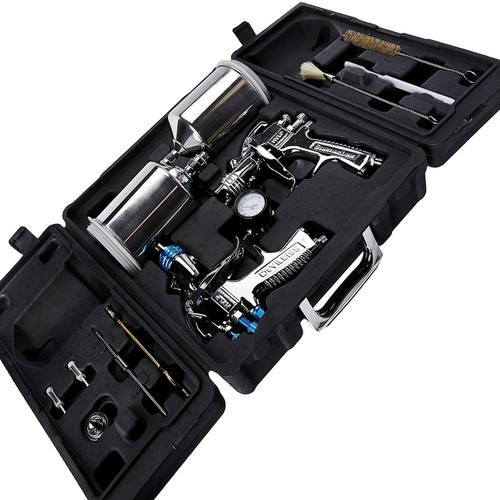 The DeVilbiss 802343 StartingLine Auto Painting/Priming System is a complete 2-gun HVLP kit for automotive refinishing, providing flexibility to spray primers, basecoats, clears, and sealers on projects big or small. Includes a full-size HVLP gun with 1.3 mm fluid tip (600 cc cup) for light-viscosity basecoats and clears, and a priming gun with 1.8 mm tip (600 cc cup) for medium-heavy primers and sealers. Both guns feature high transfer efficiency, easy controls, and accurate air caps. Kit also includes air regulator with gauge, cleaning brushes, wrench, and molded case.
