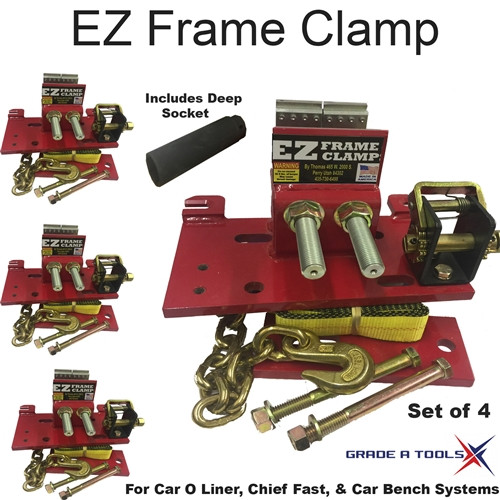 The EZ Frame EZF-2001COL Easy-2-Clamp Frame Anchoring - Alternative Car-O-Liner Anchoring System is the complete conversion kit from EZ Frame Clamps that upgrades your Car-O-Liner rack for fast, universal truck and full-frame anchoring. One-man 15-minute setup using your existing deck strapping system, works on unibody, full-frame trucks, SUVs, and vans. Made in the USA from tool-grade steel with replaceable wear parts.
