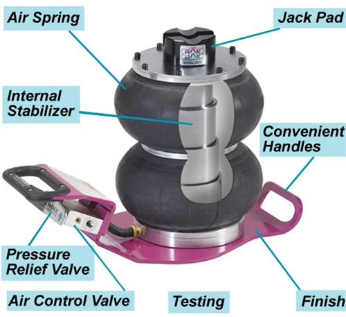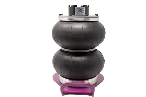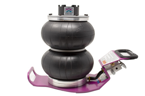 The Go-Jak DBT2L is a 2-ton double bag air jack with long handle and 10" diameter bladder. Requires 105 PSI air pressure. Relaxed height: 5.75" (146mm). Full extension: 13.75" (349mm). Fitting: 1/4" NPT. Adjustable top swivels 360 degrees for easy vehicle jack points. Powder-coated steel frame with balanced long handle for transport. Pressure relief valve prevents over-inflation. Made in USA.
