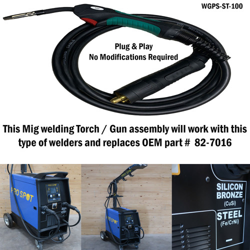 The Green Handle Steel MIG Gun-Torch Assembly ST-100 is a non-OEM replacement built specifically to work with ProSpot SP-5 DP, SP-5.3, and SP-205MV welders. The bright green molded handle with white “Steel” tag makes it instantly recognizable as the dedicated steel-welding torch. Comes with a 10' steel-lined graphite lead (Euro connector), ergonomic swivel ball handle to reduce fatigue, and is true plug-and-play — direct replacement for ProSpot part #82-7016 with zero modifications. Includes a 21-piece consumable kit (CTD-WG-KIT-G21, $79 value) and liner protector.