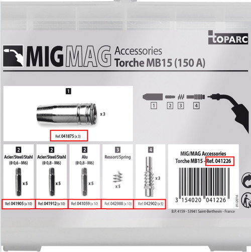 GYS-Mig welding torch consumable kit, this kit is for 150 amp torches. The kit includes Contact tips, Diffusors, Nozzles, Nozzle spring and Cone nozzles.