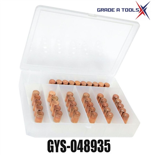 The GYS-048935 Spot Weld Caps - Electrodes 13mm Type A (40 Pack) are genuine OEM flat electrodes for GYS resistance spot welders. Precision-manufactured for consistent performance and extended tip life, these premium 13mm caps deliver clean, strong spot welds on steel panels. Compliant with automatic welding parameters, they work with water-cooled and non-water-cooled units including Gyspot PTI Evolution and GYSPOT BP.LCX-S7. Includes durable hard plastic storage case.