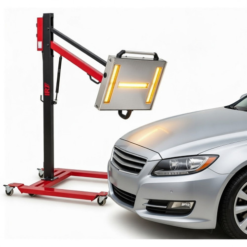 Hedson IRT-4 PrepCure mobile infrared curing lamp with 1 cassette for fast drying of putty, filler, base, and clear coat on small to medium surfaces. 3 kW short-wave power, two manual timers for flash-off (50% power) and full bake (100% power). Gold-coated FreeForm reflectors for even heat, particle filter, powerful ventilation. 40" x 43" cure area at 24" distance, 220V single-phase.