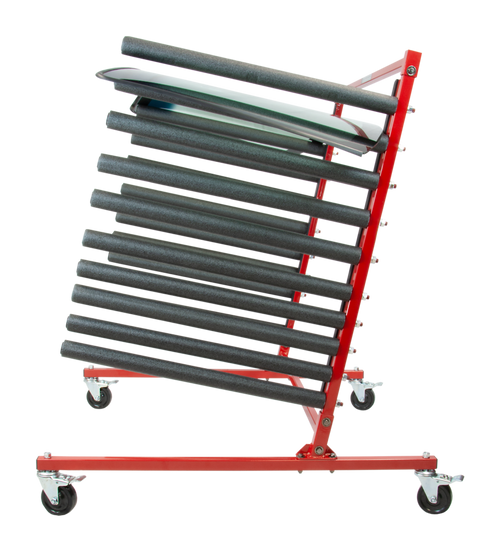 The Innovative I-MGR Mobile Glass Rack is a durable mobile storage solution for collision repair shops, safely holding up to 10 windshields or back glass with no metal-on-glass contact thanks to extensive rubber and foam padding. Its unique 14-degree pitch-back design allows quick, easy loading and unloading, while heavy-gauge steel construction with powder-coat finish ensures longevity. Rolls smoothly on total-lock casters for stability in bays or storage. Recommended for medium-sized shops. Manufacturer Part # I-MGR.