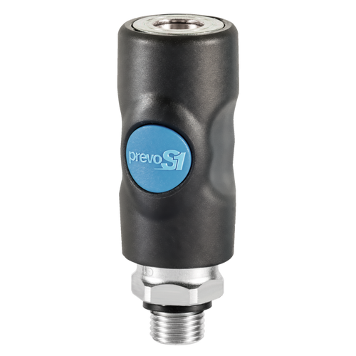 The Prevost ISI 061251 Industrial Safety Air Coupler Kit includes 10 male 1/4" MNPT prevoS1 safety couplers with non-marring composite bodies and distinctive blue push-button, plus 10 matching industrial profile steel plugs. Featuring one-push connection and automatic venting for safe disconnection without hose whip, this kit provides reliable, high-flow performance for general workshop and industrial pneumatic systems while protecting finished surfaces.