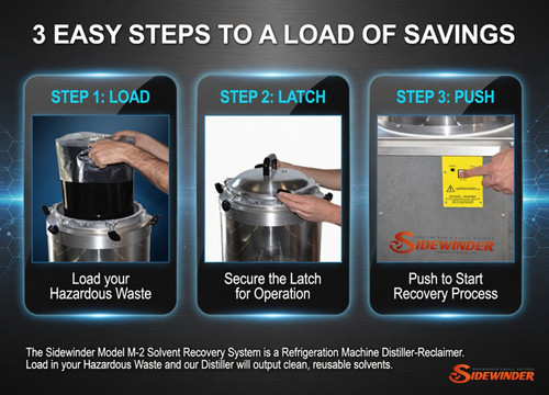 Sidewinder M-2 Paint Solvent Recycler is a UL-listed solvent distillation unit that recycles waste paint thinners and solvents. It turns dirty gun wash, thinners, reducers and acetone into clean reusable solvent. The self-monitoring system automatically shuts off when the cycle is complete. The Sidewinder Model M-2 has been tested and certified by Underwriters Laboratories (UL) for use in a normal, non-hazardous location. This made in the USA recycler saves money by turning old thinner to new.