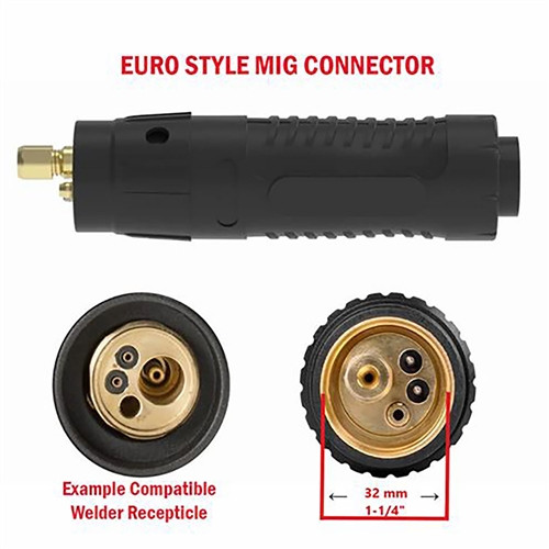 The Silicon Bronze MIG Torch / Welding Gun Assembly SB-100 Series is a non-OEM replacement designed for ProSpot SP-2 (Smart MIG), SP-5 DP (Single Phase Double Pulse), and SP-5.3 (Smart Pulse) welders. Features a durable red molded handle with a white “Si Bronze” tag for instant identification, a 10' red SiB-lined graphite liner with Euro connector, and an ergonomic swivel ball handle to reduce hand fatigue. True plug-and-play replacement for ProSpot part #82-7015 — no modifications needed. Includes a 21-piece consumable kit (CTD-WG-KIT-R21, $79 value) plus heavy-duty liner guard. Replacement liners and consumables available.