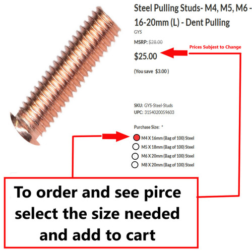 Steel dent pulling weld studs works with a most all steel dent pulling system and models studs come in M4, M5, M6, M8 sizes and are 16-20mm long. These are the round-faced studs that are the most commonly used in the collision repair industry. Available in Bags of 100. See our order menu for available sizes and quantities. 059603, 049383, 069369, 063976, GYS. see our photos for more information