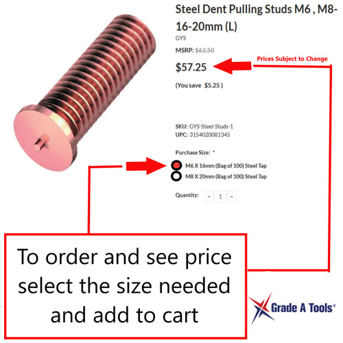 M6 & M8 Steel dent pulling studs, the studs are used with dent pulling systems for heavy pull on steel panels such as rockers and structural panels made of steel. The M6- M8 (16-20mm long) in bags of 200. GYS - copper coated steel studs dent pulling stud 081345, 081352. See photos for more details.