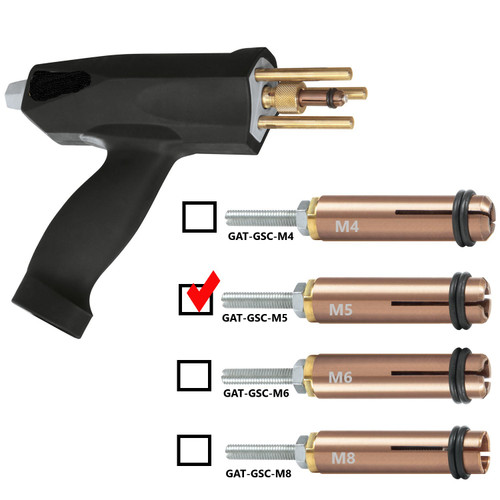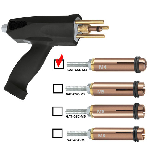 Weld Stud Chuck holder works with screw sizes form M4, M5, M6 & M8. stud Electrodes will work with GYS Dent pulling systems such as GYSPOT ALU 66, ALU PRO FV, Combispotter, ARCPULL, works with aluminum and steel threaded studs.