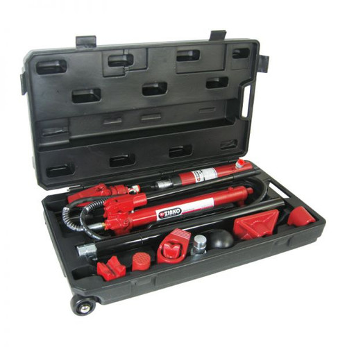 The Zinko ZPK-10 10-Ton Portable Hydraulic Body Repair Kit – comprehensive portable set for collision repair, industrial, and construction tasks requiring pushing, pulling, spreading, clamping, and lifting. Features a single-speed hydraulic pump (ZHP-28), 10-ton 6" stroke ram (ZAR-106SP), spreader ram, extension tubes (5", 10", 14", 19"), and versatile accessories in a wheeled carrying case. Built with high-strength tubing and overload protection for safe, durable use up to 10,000 PSI – quick snap-together setup with no modifications needed.